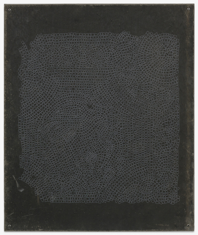 In *Copies and Columns* Moris employs archeological and preservation analogies in combination with constructional and decorative practices in order to produce a system of spatial and conceptual subversion. The third part of the show, a text written by the artist, is dispersed around the wall pieces as unexpected supporting elements that fill up the ruined empty areas of the wireframe mosaic compositions. Both theoretic and poetic in character, the text traces the movement from the intimate scale of manual gesture to the ones of natural entropic processes and tectonic production by way of an idiosyncratic kaleidoscopic logic.